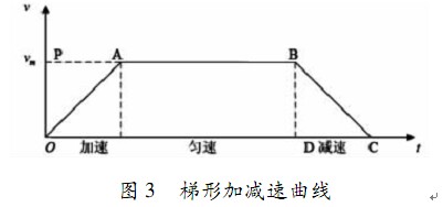 直線加減速控制又稱梯形速度曲線控制, 它使機(jī)床啟動時, 速度按照一定斜率的直線上升, 在停止時, 速度沿一定斜率的直線下降。如圖3 所示。