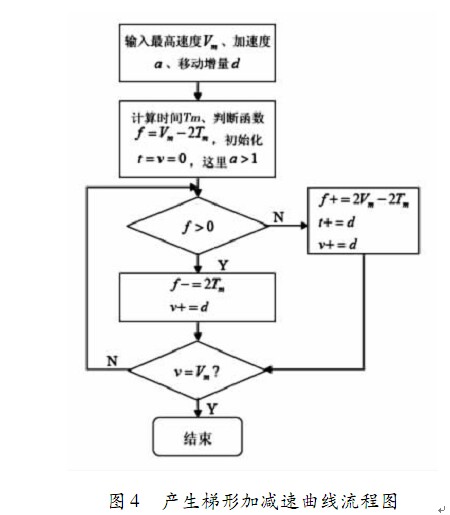 以加速階段分析: 其關(guān)系式可表示為 V = a* t。在給定最高速度 Vm 的情況下, 到達(dá)時間 Tm = Vm/a, 一般的實現(xiàn)方法是時間t 從0 開始遞增, 對應(yīng)每個t 代入式v = a* t 中計算出v, 這個方法可行但是計算量太多, 涉及到浮點運算。不利于在嵌入式系統(tǒng)中運用。為了提高運算的效率, 減小浮點運算量, 利用插補算法, 以數(shù)字方式實現(xiàn)運動過程。采用最小偏差法, 來實現(xiàn)直線運動, 軟件實現(xiàn)其過程的流程圖如圖4 所示。