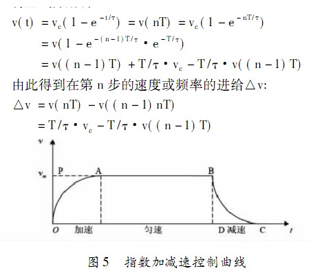 指數(shù)加減速曲線如圖 5 所示。它的加速和減速曲線是對稱的。下面以加速階段研究指數(shù)運行曲線。其運行速度公式為 v( t) = vc ( 1 - e- t /) , 其中 Vc 代表終點速度或是頻率, t 代表時間,代表調(diào)節(jié)系統(tǒng)時間常數(shù)。時間常數(shù) 反映了系統(tǒng)從速度0 變化到給定的最高速度的變化效率, 加速過程的時間受該常數(shù)的約束, 所以采用指數(shù)曲線進(jìn)行加減速要根據(jù)系統(tǒng)選好時間常數(shù) [3]。