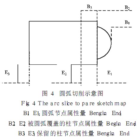 為了得到連續、動態的切削效果,屏幕畫面必須不斷刷新. 由于是可旋轉的三維圖像,每次刷新時僅將切削處重畫是不行的,必須將整根軸重畫.但如果將整根軸完全重畫,計算量大、耗時長、效率低,為此,利用了顯示表對切削過程的模擬進行優化. 在上面提到的軸節點中,有一G l u n i t 類型屬性量i n d e x ,即是該節點的顯示表. 這樣,該節軸在沒有變化之前,程序里實際上只畫了一次,即將繪圖命令執行結果存儲在緩存中,以后每次顯示時只需執行g l C a l l L i s t ( i n d e x ) 即可. 由于采用了面向對象的列表結構,整根軸的顯示可以轉化為列表的遍歷,依次調用每個節點的顯示表,迅速完成圖形顯示. 而且,復雜的切削過程也轉化為對列表和各個節點的操作,如在某段柱體上切削圓弧只需在柱節點前插入一圓弧節點,同時將原柱體分為 2段, 1個節點分為 2個,前面的節點代表圓弧未曾涉及的部分,長度由 B3到E3( 如圖 4所示) .