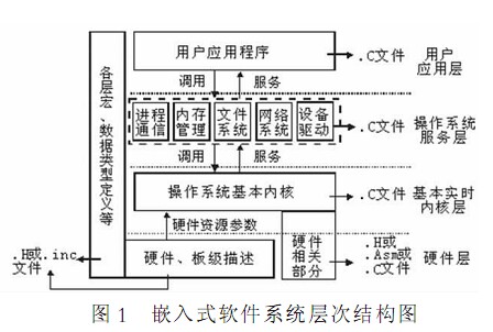 根據(jù)嵌入式軟件的特點 如圖 1 所示 將嵌入式軟件系統(tǒng)自下而上共分為四層 硬件層 基本實時內(nèi)核層 操作系統(tǒng)服務層和用戶應用層 各層之間通過各層的頭文件進行聲明和調(diào)用