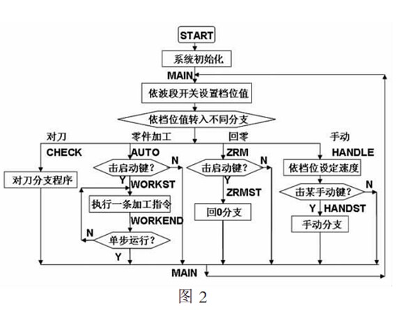 由圖 可見有零件加工 手動 回零 對刀等四個功能程序段 另外還有三段中斷服務程序 控制加工速度的定時器 中斷服務程序 實現暫停功能的外部中斷 中斷服務程序 實現入群的通信程序 串行口中斷服務程序