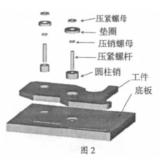 夾具主要山底板、圓柱定位銷、壓緊螺桿、壓銷螺母、墊圈及壓緊螺母構成