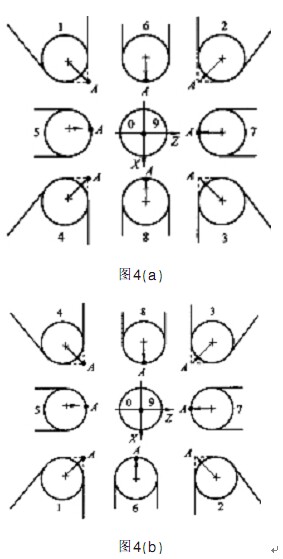 根據車刀的形狀確定位置參數,數控車削使用的刀具有很多種,不同類型的車刀其刀尖圓弧所處的位置不同,如圖所示〔)將車刀的形狀和位置用刀尖方位參數T來表示,A點為假象的刀尖點,刀尖方位參數共有8個(n -g) >當使用刀尖圓弧中心編程時,可以選用?;?/span>9})圖(a)為刀架前置的數控車床假象刀尖的位置;圖((b)為刀架后置的數控車床假象刀尖的位置、