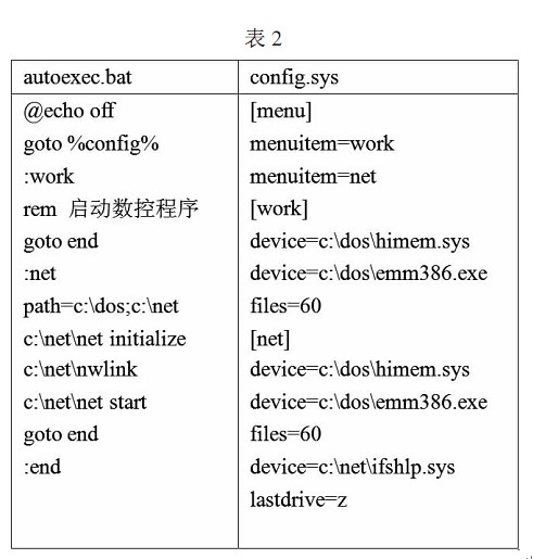 客戶端計(jì)算機(jī)如果是帶有 Windows 操作系統(tǒng)的計(jì)算機(jī),那么網(wǎng)卡的安裝與網(wǎng)絡(luò)參數(shù)設(shè)置同上,不用設(shè)置共享文件夾工作組名稱一定要相同,IP 地址應(yīng)該在同一網(wǎng)段,這樣客戶端用戶就可以通過訪問服務(wù)器端計(jì)算機(jī)上的共享文件夾直接獲取所需數(shù)控文件 如果客戶端計(jì)算機(jī)是 DOS 操作系統(tǒng),那么就需要安裝 MS Client 軟件來配置計(jì)算機(jī) MS Client 軟件的安裝盤有兩張軟盤,一般只用到第一張 將所用網(wǎng)卡的 NDIS網(wǎng)卡驅(qū)動(dòng)程序 *.DOS 復(fù)制到此軟盤內(nèi),MS Client 軟件安裝網(wǎng)卡時(shí)要用到 運(yùn)行安裝程序,按照安裝程序的提示依次輸入所需信息 注意工作組和用戶的名字一定要與服務(wù)器端設(shè)置的名字一致,通信協(xié)議 (protocol ) NetBEUI 必選,如果是 ISA總線的網(wǎng)卡,還需要設(shè)置中斷號(hào)和 I/O 地址 安裝完成后系統(tǒng)會(huì)在根目錄下生成新的 AUTOEXEC.BAT 和 CONFIG.SYS 文件,為了工控機(jī)正常運(yùn)行需要將其配置為多任務(wù)啟動(dòng)方式在需要傳輸文件時(shí)系統(tǒng)進(jìn)入聯(lián)網(wǎng)模式,不需要是關(guān)閉網(wǎng)絡(luò)連接,釋放系統(tǒng)資源提高系統(tǒng)運(yùn)行速度 假設(shè) MS Client 軟件安裝在 c:\net 文件夾內(nèi),那么文件內(nèi)容如表2所示