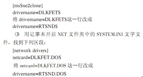 ( 1 ) 將磁盤中 NET 文件夾原來的DFE530-TX 網(wǎng)卡驅(qū)動(dòng)程序刪除 (文件名為DLKFET.DOS),將RTL8139 的 NDIS 網(wǎng)卡驅(qū)動(dòng)程序RTSND.DOS 復(fù)制到此 NET 文件夾內(nèi)