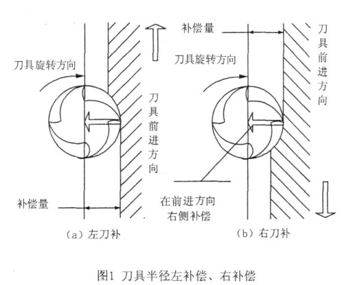 刀具半徑補償?shù)闹噶罡袷綖?/span>: G41 D ; G42D . G41 是刀具半徑左補償指令 , 順著刀具直線前進的方向看 , 刀具在左邊 , 工件在右邊 , 此時刀心在工件的左邊, 離工件的輪廓相差一個刀具半徑值, 需對刀具進行左補償, 補償值用 D 及后面的號碼確定.G42為刀具半徑右補償指令, 順著刀具直線前進的方向看, 刀具在右邊, 工件在左邊, 此時刀心在工件的右邊,離工件的輪廓相差一個刀具半徑值, 需對刀具進行右補償, 補償值用D及后面的號碼確定[1 ](如圖1) .