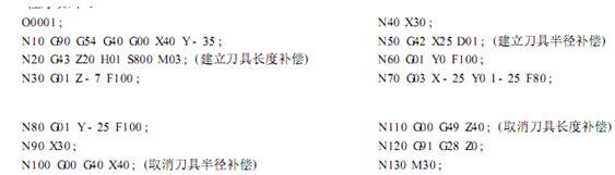 由上例可知 , 加入刀具半徑補償和長度補償功能后 , 數(shù)控編程均可按圖形輪廓的尺寸進行.