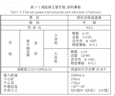 本項目以一級圓柱齒輪減速器作為研究對象,根據(jù)文獻[1]通過運動分析 力學分析等,計算得出的結構性能參數(shù)列入表 1- 1,其結構簡圖如圖1- 1所示