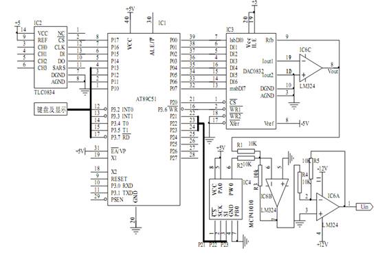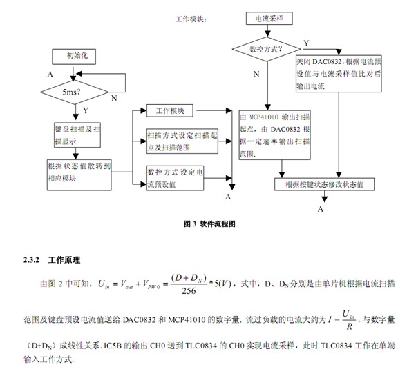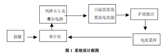 本系統(tǒng)有兩種工作方式,其一是數(shù)控電流源,其二是數(shù)控掃描電流源. 在第一種工作方式時(shí),由鍵盤(pán)預(yù)設(shè)電流值、關(guān)閉掃描電流源,根據(jù)預(yù)設(shè)電流值由數(shù)字電位器實(shí)現(xiàn) D/A 轉(zhuǎn)換,并利用運(yùn)放工作在電流負(fù)反饋的特點(diǎn)及三極管擴(kuò)流獲得直流電流源. 在第二種工作方式時(shí),由鍵盤(pán)預(yù)設(shè)掃描起點(diǎn)的電流值、掃描電流范圍,根據(jù)預(yù)設(shè)掃描起點(diǎn)的電流值由數(shù)字電位器實(shí)現(xiàn) D/A 轉(zhuǎn)換作為掃描電流的起始值,同時(shí)與由并行 D/A 轉(zhuǎn)換器以一定速率實(shí)現(xiàn)的掃描電流值相疊加,然后利用運(yùn)放工作在電流負(fù)反饋的特點(diǎn)及三極管擴(kuò)流獲得一定初始值的掃描直流電流源.