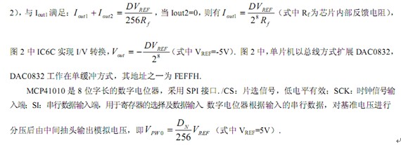 DAC0832 是 8 位雙緩沖電流型 D/A 轉(zhuǎn)換器. 工作電壓 VCC:+5V~+15V,基準(zhǔn)參考電壓 VREF:+10V~-10V,ILE:允許輸入鎖存,高電平有效;/CS:低電平有效;/WR1(寫(xiě)信號(hào)1)低電平有效,用來(lái)將總線送來(lái)的數(shù)據(jù)鎖存于輸入鎖存器中. /WR2(寫(xiě)信號(hào) 2)低電平有效,用于將輸入鎖存器中的數(shù)據(jù)傳送到 DAC 鎖存器中并鎖存起來(lái). /XFER(傳送控制信號(hào)) :低電平有效,用來(lái)控制/WR2,選通 D/A轉(zhuǎn)換. Iout1(DAC 電流輸出端 1,電流穩(wěn)定時(shí)間為 1 微秒) ,當(dāng)數(shù)字量全 1,輸出 Iout1最大. Iout2(DAC 電流輸出端