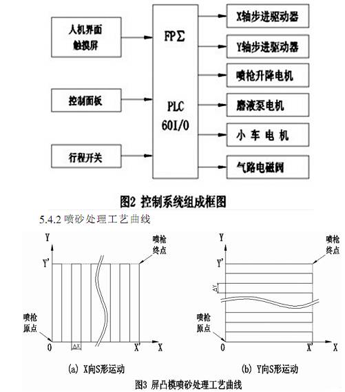 執(zhí)行自動(dòng)控制程序時(shí) 工件放在小車(chē)上后 按 運(yùn)行 按鈕 小車(chē)啟動(dòng)和工件一起運(yùn)行到工作艙內(nèi)停在加工位置 同時(shí)艙門(mén)關(guān)閉 此時(shí)磨液泵啟動(dòng) 氣路電磁閥打開(kāi) 噴槍按照觸摸屏上設(shè)定的工藝曲線在步進(jìn)電機(jī)的驅(qū)動(dòng)下進(jìn)行噴砂處理 當(dāng)噴槍走完工藝曲線回到原點(diǎn)時(shí) 磨液泵停止工作 壓縮空氣關(guān)閉 小車(chē)啟動(dòng)將工件運(yùn)出工作艙 完成工件加工