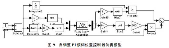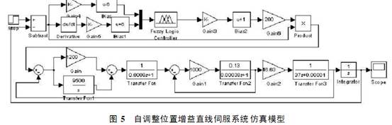 Simulink 環(huán)境中,建立了以直線電機(jī)為伺服執(zhí)行元件的自適應(yīng)模糊位置控制系統(tǒng)的仿真模型( 圖5) .