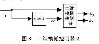 為了減小穩(wěn)態(tài)誤差,考慮位置控制器加入積分環(huán)節(jié).但如果簡(jiǎn)單地加入一個(gè)普通積分環(huán)節(jié),通過仿真發(fā)現(xiàn),在減小穩(wěn)態(tài)誤差的同時(shí),系統(tǒng)比原來的模糊控制容易出現(xiàn)超調(diào).基于以上考慮,設(shè)想積分系數(shù)也用模糊控制器來調(diào)節(jié), 以便達(dá)到期望的效果.則模糊控制器結(jié)構(gòu)變?yōu)閳D 8所示.