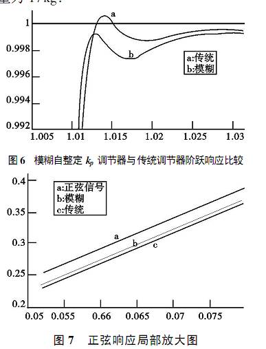 仿真結(jié)果如圖 6、 圖 7 所示. 從圖 6 可以看出:采用模糊控制后的系統(tǒng)響應(yīng)變快,并且不容易產(chǎn)生超調(diào).負(fù)載為 17kg 時(shí), 傳統(tǒng)控制已出現(xiàn)較大超調(diào),但模糊控制還沒出現(xiàn). 精密數(shù)控機(jī)床是不允許出現(xiàn)超調(diào)的,一旦出現(xiàn), 產(chǎn)品將成為次品.但是模糊控制的穩(wěn)態(tài)誤差比傳統(tǒng)誤差大,分析原因,主要是在設(shè)置模糊規(guī)則的時(shí)候, 為了在負(fù)載較大時(shí),響應(yīng)依舊不出現(xiàn)超調(diào),當(dāng)誤差為PS 時(shí), $ kp 為ZO 或PS,相對(duì)應(yīng)的kp 值較小,穩(wěn)態(tài)誤差自然大.從圖7 可以看出:自調(diào)整位置增益模糊控制后系統(tǒng)的跟隨性比傳統(tǒng)控制好.