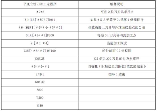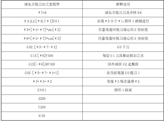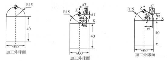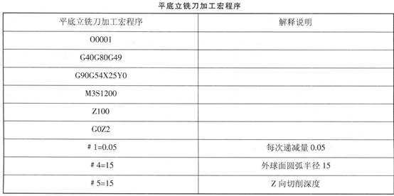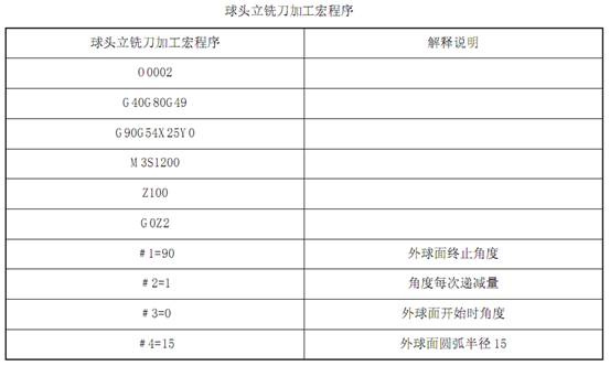 根據(jù)加工圖例加工內(nèi)容為外球面。為了對(duì)刀方便,宏程序編程零點(diǎn)在球面最高點(diǎn)處,分別采用從上向下和自下而上加工方式。平底立銑刀加工宏程序號(hào)為O0001,球頭立銑刀加工宏程序號(hào)為 O0002。