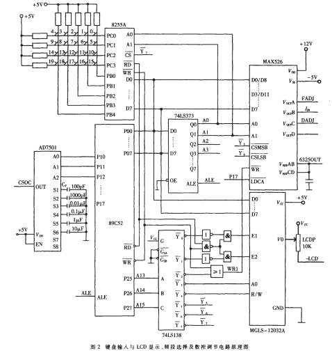 數(shù)字化波形發(fā)生器主要由主控制器單片機 89C52、鍵盤與顯示電路、波形發(fā)生器 MAX038、 12 位 4 路數(shù)模轉(zhuǎn)換器 MAX526、頻段控制單元、幅值控制單元等單元電 路 組 成 。 單 片 機 主 要 完 成 對 鍵 盤 輸 入 的 檢 測 、對MAX038 輸出波形的選擇、 對 D/A 輸出控制, 從而完成對頻率和占空比的調(diào)節(jié)及對頻段的選擇; 鍵盤采用 4× 5的矩陣鍵盤, 分別設置了數(shù)字鍵( 0~9) 和功能鍵( 小數(shù)點" ."、 頻段、 頻率、 占空比、 幅值、 正弦波、 方波、 三角波、取消等) 共 19 個鍵。使用時先按功能鍵后按數(shù)字鍵; 顯示部分采用 LCD 顯示頻率(6 位)和幅值(4 位); MAX038函數(shù)發(fā)生器芯片是系統(tǒng)的核心部分, 在單片機的控制下輸出正弦波、 三角波、 矩形波, 且波形的頻率和占空比易于調(diào)節(jié); 12 位 4 路輸出的數(shù)模轉(zhuǎn)換器 MAX526 在單片機的控制下, 輸出 2~750μ A 的電流及± 2.4V 和± 2.3V 的電壓, 分別進行頻率、 占空比的調(diào)節(jié); 頻段選擇單元采用 8選 1 的多路模擬開關 AD7501, 在單片機的控制下使每一路分時選通, 將不同的電容值 CF 接入 MAX038 電路中, 就可確定輸出頻率范圍, 即頻段, 共有 6 個頻段供選擇切換, 輸出波形頻率范圍與 CF 的關系如表 1 所示。幅度控制單元主要調(diào)節(jié)輸出信號的幅度, MAX038 輸出端OUT 的 VP - P =2V 幅度值通過放大器放大后送入數(shù)字衰減器 AT- 280 中進行衰減, 調(diào)整放大后的輸出幅度。鍵盤輸入與顯示、 頻段選擇及數(shù)控調(diào)節(jié)電路原理圖如圖 2所示。