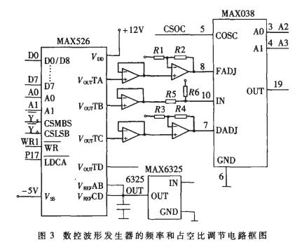 MAX038 的輸出頻率主要受振蕩器電容 CF、 IIN 端電流 IIN 和 FADJ 端電壓 VFADJ 控制。選擇一個 CF 值, 對應IIN 端電流變化, 將產(chǎn)生一定范圍的輸出頻率。另外, 改變 FADJ 端的電壓, 可以在 IIN 控制的基礎上, 對輸出頻率實現(xiàn)微調(diào)控制。 可通過電壓輸出型的 DAC MAX526 實現(xiàn)輸出頻率的數(shù)控調(diào)節(jié)。MAX038 的 IIN 端和 FADJ 端分別連接到 MAX526 的 VOUTA 和 VOUTB 兩個輸出端上。通過 V B 產(chǎn)生 0V( 00H) 到2.5V( 0FFH) 的輸出電壓, 再經(jīng)電壓/電流轉(zhuǎn)換網(wǎng)絡, 在 IIN 端產(chǎn)生 0μ A 到 750μ A 的工作電流, 使之產(chǎn)生相應的頻率范圍。VOUTB 將此工作電流范圍分為 256 級步進間隔, 輸出頻率范圍也被分為 256級步進間隔。所以, IIN 端電流實現(xiàn)了對輸出頻率的粗調(diào)。VOUTA 在 FADJ 端產(chǎn)生一個從- 2.4V( 00H) 到+2.4V( 0FFH) 的電壓范圍, 該范圍同樣也包含 256 級步進間隔, 將 IIN 端的步進間隔再次細分為 256 級步進間隔,從而在粗調(diào)的基礎上實現(xiàn)微調(diào)。各頻段的頻率范圍劃分為 65 536 級間隔。 MAX526 的 VOUTC 在 DADJ 端產(chǎn)生一個從- 2.3V( 00H) 到+2.3V( 0FFH) 的 電壓 調(diào)節(jié)范 圍, 對 占空比實現(xiàn)數(shù)字控制, 該范圍包含 256 級步進間隔。VOUTC的每一級步進對應著 Δ V=[2.3- ( - 2.3) ]/256=17.9mV 和V%=( 90%- 10%) /256=0.3125。調(diào)節(jié)占空比時應盡量避免輸出頻率發(fā)生變化。僅當 δ =15%~85%且 25μ A<IIN<250μ A 時, 對頻率影響最小。數(shù)控波形發(fā)生器頻率和占空比調(diào)節(jié)電路的原理圖如圖 3 所示。