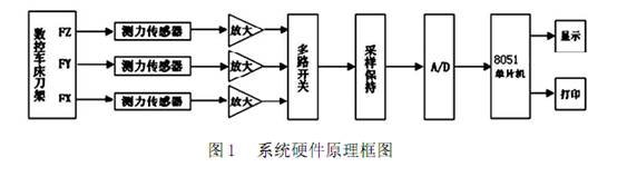 在數(shù)控車床的加工中,切削力的丈量甚為重要。經(jīng)過對切削力的丈量能夠剖析與研討數(shù)控車床各零部件、組織或構(gòu)造的受力狀況和作業(yè)狀況,驗證規(guī)劃和計算成果的正確性,確定整機作業(yè)過程中的負(fù)載譜和某些物理表象的機理。為了便于丈量和研討數(shù)控車床切削力起見,特別是為了習(xí)慣出產(chǎn)中規(guī)劃和運用數(shù)控機床、刀具和夾具的需求,通常都把總切削力F 分解成三個相互筆直方向的力,即Fz 、Fy 、Fx 來研討。體系硬件原理框圖如圖1 所示。體系以MCS8051 單片機為操控中心,外圍電路對于單片機的功能特色而規(guī)劃,充分利用了MCS8051 單片機片內(nèi)資源豐富的特色,簡化了外圍電路,提高了可靠性。下面臨體系中首要功能模塊與硬件可靠性技能逐個剖析。