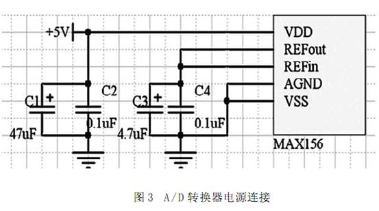 內(nèi)部的2.5V 基準(zhǔn)源輸出端(REFOUT)有必要經(jīng)過1個4.7μF的電解電容和1個0.1μF 的瓷片電容旁路到模仿地,以確保器材的穩(wěn)定性。VDD應(yīng)經(jīng)過1個47μF的電解電容和1個0.1μF的瓷片電容接到模仿地(圖3)。