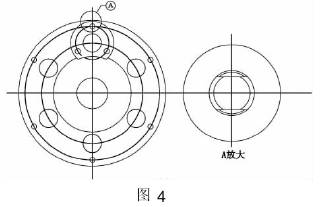 在夾具盤圓周面上可均勻分布同時安裝六個零件進行一次裝夾同時加工。利用削邊銷采用工件上已鉆削出的三個均布孔中的其中一個作為工件止轉定位,可保證圓弧表面的位置精度。 如(圖 4)所示: