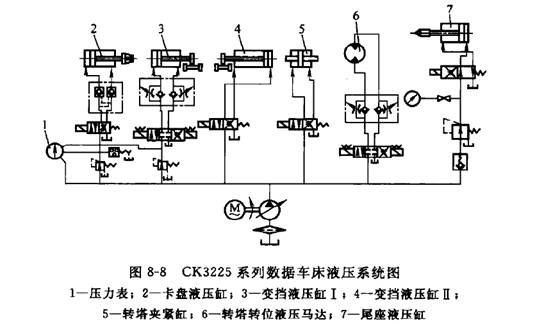 液壓變速機構在數(shù)控機床上得到普遍使用。圖8-9為一個典型液壓變速機構的原理圖。三個液壓缸都是差動液壓缸,用Y型三位四通電磁閥來控制。滑移齒輪的拔叉與變速液壓缸的活塞桿連接。當液壓缸左腔進油右腔回油、右腔進油左腔回油或左右兩腔同時進油時,可使滑移齒輪獲得左、右、中三個位置,達到預定的齒輪嚙合狀態(tài)。在自動變速時,為了使齒輪不發(fā)生頂齒而順利地進人嚙合,應使傳動鏈在低速下運行。為此,對于采取無級調速電動機的系統(tǒng),只需接通電動機的某一低速驅動的傳動鏈運轉,對于采用恒速交流電動機的純分級變速系統(tǒng),則需設置慢速驅動電動機MZ,在換速時啟動Mz,驅動慢速傳動鏈運轉。自動變速的過程是:啟動傳動鏈慢速運轉~根據(jù)指令接通相應的電磁換向閥和主電動機M1的調速信號‘齒輪塊滑移和主電動機的轉軸接通一相應的行程開關被壓下發(fā)出變速完成信號,斷開傳動鏈慢速轉動~變速完成。