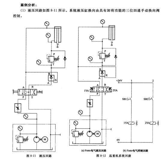 (1)圖8-11中,當Y型三位四通手動閥位于中位時,液控單向閥關閉,由于液控單向閥的密封性很高,可以對液壓缸進行鎖定。即使是在液壓系統出現壓力故障時,液控單向閥仍能使液壓缸活塞桿長期維持原位,重物懸停。