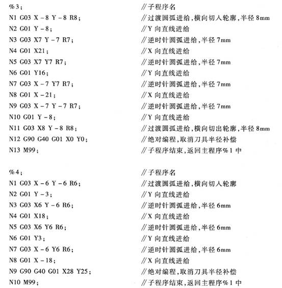 用木錘或銅棒敲擊工件,使平行墊塊不能移動后夾緊工件。利用尋邊器找正工件X, Y軸零點,使之位于工件對稱中心位置。設置Z軸零點與機械原點重合。刀具長度補償利用Z軸定位器設定(有時也可不使用刀具長度補償功能,而根據不同刀具設定多個工件坐標系零點進行編程加工)。工件上表面為執行刀具長度補償后的Z零點表面。