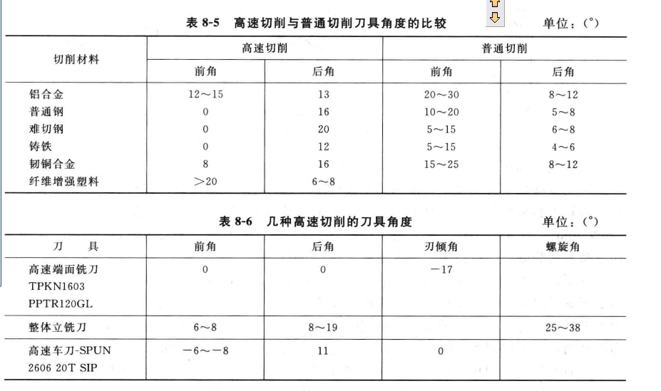 角或取副前角可有效減少月牙洼對(duì)刃口造成的不良影響。表8—5所示的高速切削與普通切削刀具的前、后角的對(duì)比,可見無論切削問種材料,高速切削比普通切削的前角約小10。,后角約大5。一8。。而高速切削不同種類材料時(shí),刀具前、后角的增減規(guī)律與普通切削相同。表8—6為幾種用于高速切削的刀具角度,車刀前角的取值范圍較大,立銑刀因具有螺旋刃,刀齒逐漸切人,沖擊小,可取較大的前角,但高速切創(chuàng)立銑刀的螺旋角較小,前角取值也不應(yīng)太大。