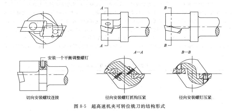 片夾緊機(jī)構(gòu)要有足夠的夾緊力。圖8—5中給出了三種刀體與刀片的安裝夾緊形式。為了調(diào)節(jié)刀具的不平衡度在刀體上徑向安裝了調(diào)整螺釘。