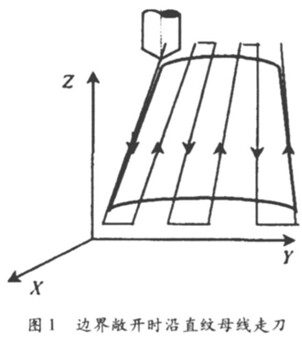 ① 當(dāng)被加工曲面的邊界敞開 ,沒有其他表面或夾具等限制時(shí) ,為安全起見 ,應(yīng)延伸曲面邊界。或者設(shè)計(jì)一個(gè)能覆蓋被加工曲面的較大的曲面 ,使刀具從曲面的邊界外加工起。如圖 1所示 ,每次沿直線走刀 ,刀位計(jì)算簡單 ,程序段少 ,加工過程符合直紋面造型規(guī)律 ,保證母線的直線度。
