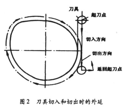 ③ 二維切削加工時(shí) ,對精度要求較高的工件曲面 ,要避免法向切入工件曲面 ,而應(yīng)與工件輪廓曲面的延長線相接觸 ,然后沿該曲線切向切入工件輪