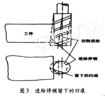 廓 ,以保證工件質(zhì)量。退刀時(shí)刀具也必須沿曲線切向退刀 ,然后再返回起點(diǎn) ,見圖 2。如果沿法向切入 ,會(huì)留下明顯的刀痕。應(yīng)盡量避免在進(jìn)給中途停頓 ,引起接刀痕 ,見圖 3。如果加工時(shí)必須進(jìn)行垂直切入 /切出引導(dǎo) ,這時(shí)必須使刀具遠(yuǎn)離工件進(jìn)行切入 ,同時(shí) ,建立刀補(bǔ) ,然后沿要求的軌跡進(jìn)行切削加工 ,當(dāng)切削完成時(shí) ,沿切出引導(dǎo)線遠(yuǎn)離已加工工件 ,同時(shí)撤離刀補(bǔ)。應(yīng)特別注意在工件被加工曲面處垂直工件表面的方向下刀或抬刀。