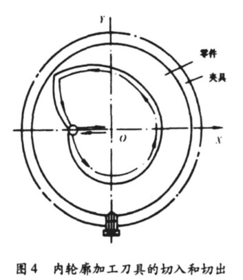 ④銑削內(nèi)槽封閉曲面的切入或切出不允許外延。這里可沿工件曲面的法線切入或切出 ,可能時(shí) ,其切入和切出點(diǎn)最好選在工件輪廓曲面兩幾何元素的交點(diǎn)處 ,見圖 4。