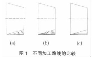 走刀路線的確定是加工程序編制的重點, 由于精加工切削程序走刀路線基本上都是沿零件輪廓形狀進行的, 因此主要內容是確定粗加工及空行程的走刀路線。走刀路線泛指刀具從起刀點開始運動起, 直到返回該點并結束加工程序所經過的路徑, 包括切削加工的路徑及刀具引入、 切出等非切削空行程。下面以圖1所示的三種車錐方法, 來分析走刀路線的合理確定。