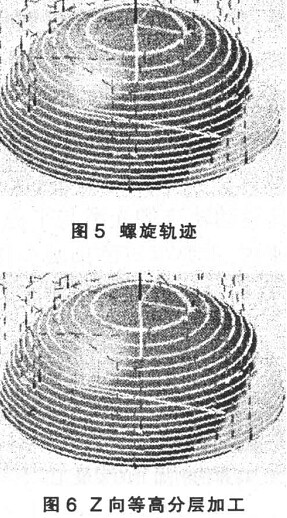 ( 5) 螺旋軌跡 ( 圖 5) 。螺旋類刀具軌跡( Rpiral) 的優點是可以避免刀具的起降與行間移刀, 對于特定類型工件, 只需要一次切入切出即可完成對工件模型表面的包絡。 該類加工策略可以用于切削圓形回轉特征, 由于避免了刀具在工件中心的重疊, 故其切削效率高于放射軌跡。但由于螺旋曲線其行距固定, 如投影至加工斜度較大的工件表面時將產生類似欲平行詭計切削陡斜面的情況, 刀具軌跡間 Z向值變化較大從而導致該區域加工質量不高, 故通常適用于較平坦的區域。